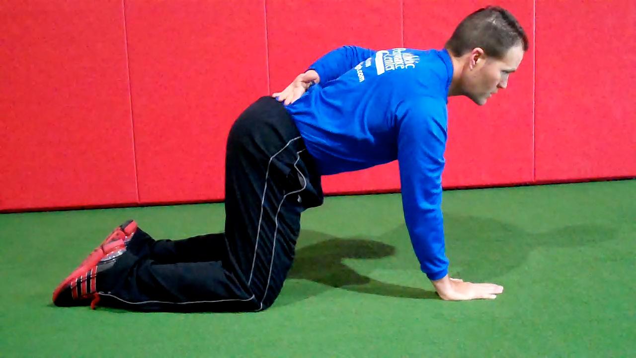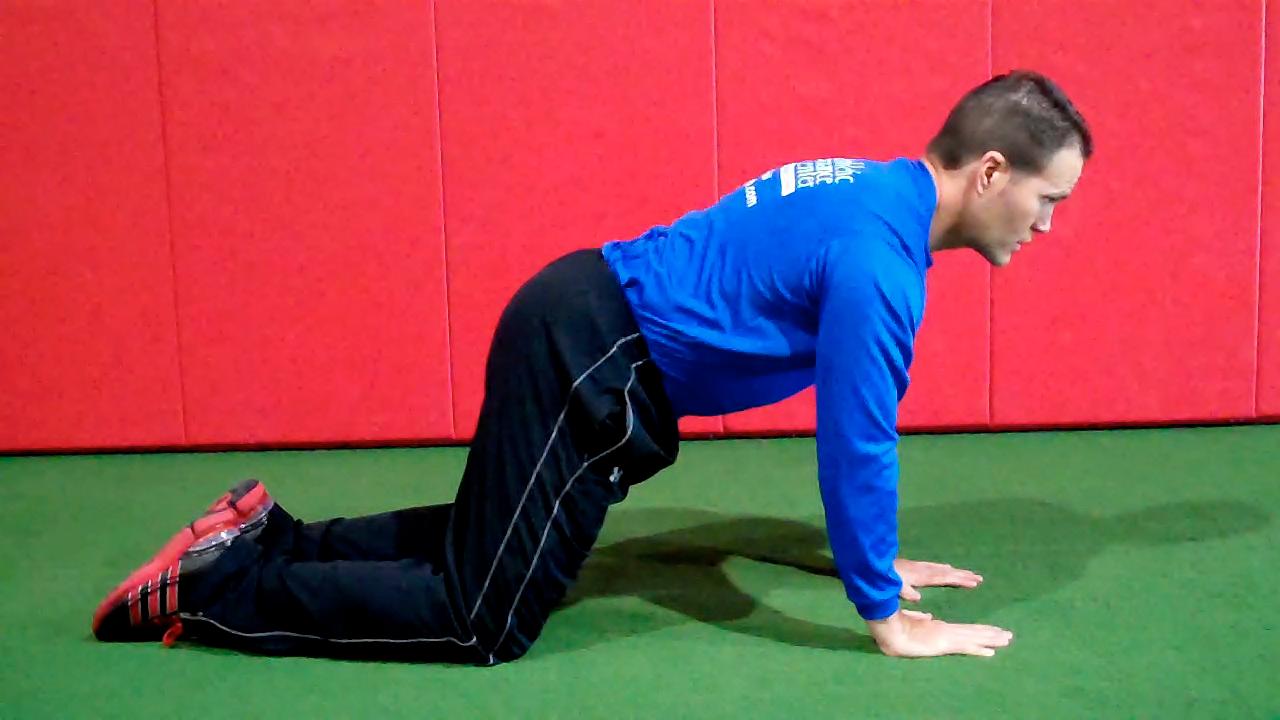 Below are two exercises I wrote about in my “Functionally Fit” column for PFP magazine. The first exercise shows quadruped rocking. Shirley Sahrmann mentions this in her work, Diagnosis and Treatment of Movement Impairment Syndromes. I began using it after reading her book, and I agree that it works very well for scapular dysfunction. Below is the start and finish position for the quadruped version as well as my own advanced tripod version of the exercise.