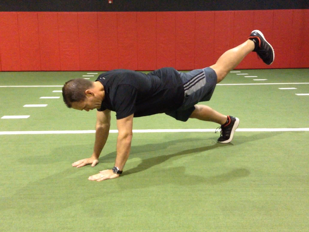 Increasing shoulder, torso and hip strength and stability is a common training goal for athletes involved in sport.  Facilitating hip disassociation and kinetic chain linking with exercise is always a plus.  I like to use a diagonal mountain climber with hip extension to accomplish these objectives. More specifically, I utilize this exercise with my overhead athletes and anyone involved in cutting, pivoting and rotational sports.